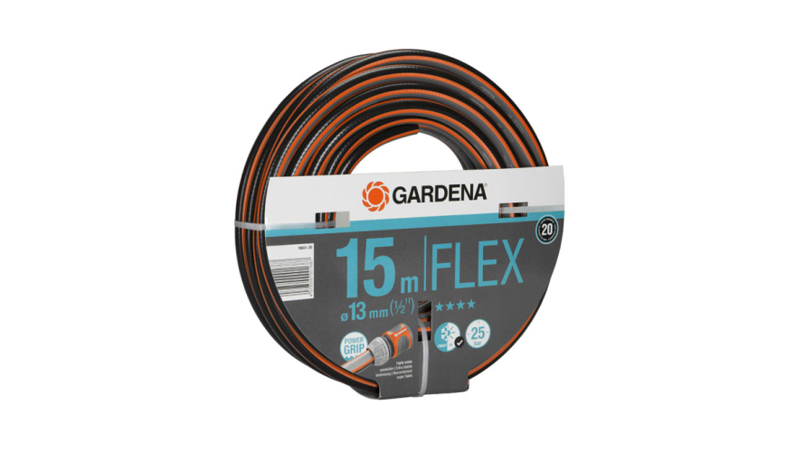The GARDENA Comfort FLEX Hose 13mm (1/2") is 15m long with a diameter of 13 mm (1/2"). Use it in the garden to irrigate your plants reliably or to carry out cleaning work. The hose is dimensionally stable and flexible, and its high-quality hose structure makes twisting or knotting almost impossible. The Power Grip profile ensures a stable connection and optimum hold between the hose and the hose connector or water stop. As the hose is UV and frost resistant, it can remain outdoors all year round. Thanks to its high wall thickness, the water hose has a long service life and is suitable for burst pressures of up to 25 bar. It is pollutant-free and therefore free of phthalates (<0.1%) as well as cadmium, lead and barium (<0.1%). Add to the elastic garden hose as required with other system parts or connection devices from the Original GARDENA System. GARDENA offers a 20-year manufacturer's warranty on the Comfort FLEX Hose, which is manufactured in Europe.
