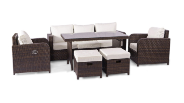 | Features | Weather resistant Premium PE Rattan White 10cm supportive cushions. Rain proof cushions Machine washable cushion covers Powder coated Aluminium Frame (New from April 2019) Sofa & Armchair: No assembly Table: Minimal assembly Available in Brown, Black or Grey Rattan 1 Year Warranty |